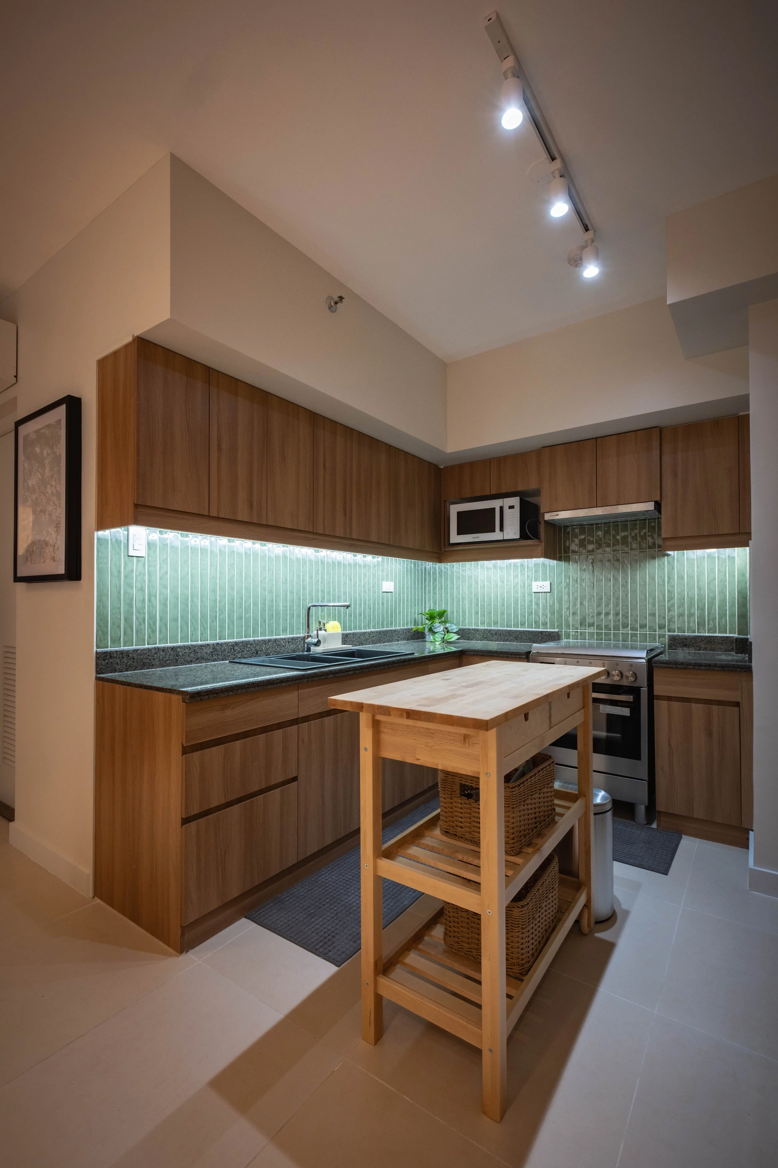 Since the space in between counters could accommodate a movable island, We placed an Ikea Förhöja kitchen cart in the middle. It provides extra preparation surface, storage, and mobility, allowing the kitchen to adapt easily for cooking, entertaining, or everyday routines.