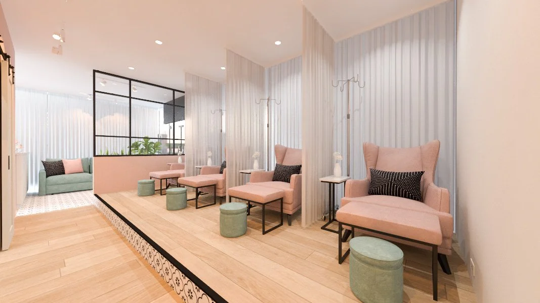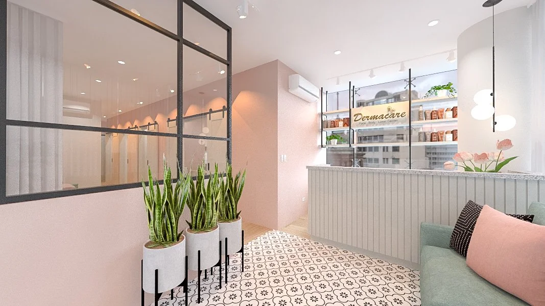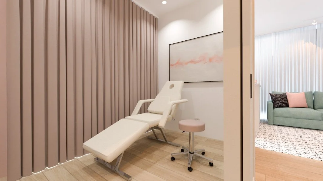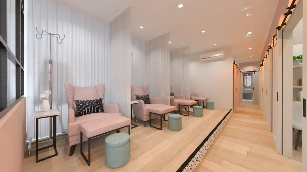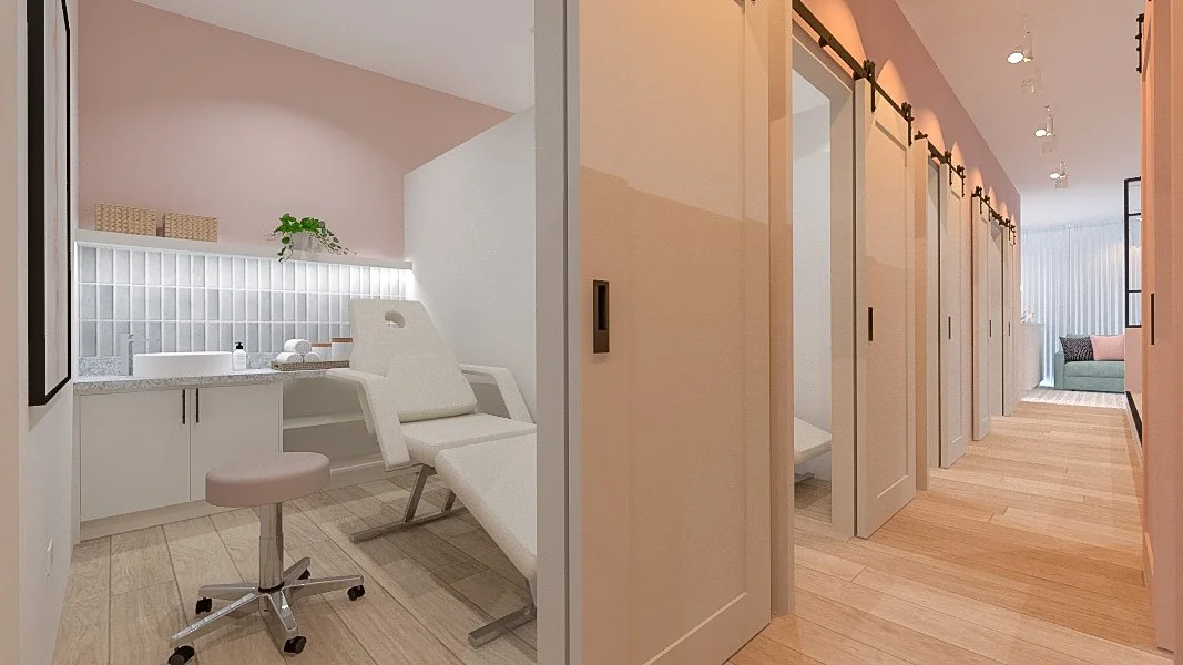 A skincare space thoughtfully designed with soft pastels, calming textures, and a seamless flow, offering a welcoming retreat where clients can relax and recharge. Completed through our Core Design service.
